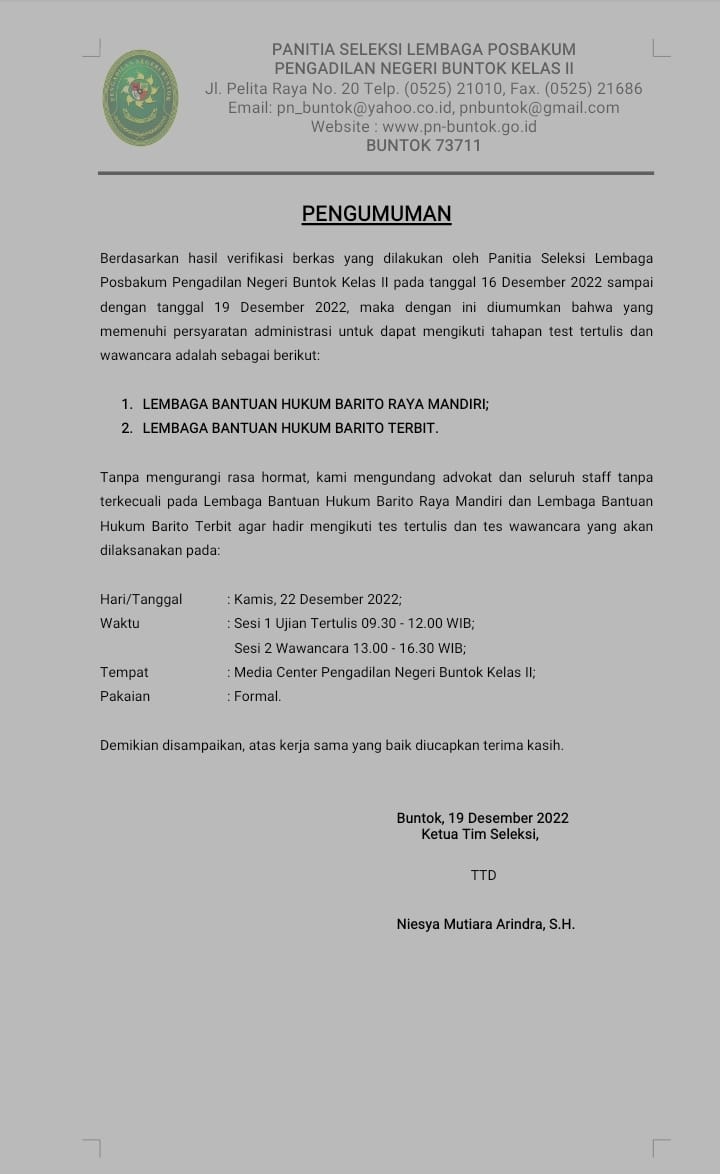 Pengumuman Peserta Lolos Seleksi Administrasi Lembaga Pemberi Layanan Pos Bantuan Hukum Pada Pengadilan Negeri Buntok Kelas II Tahun 2023